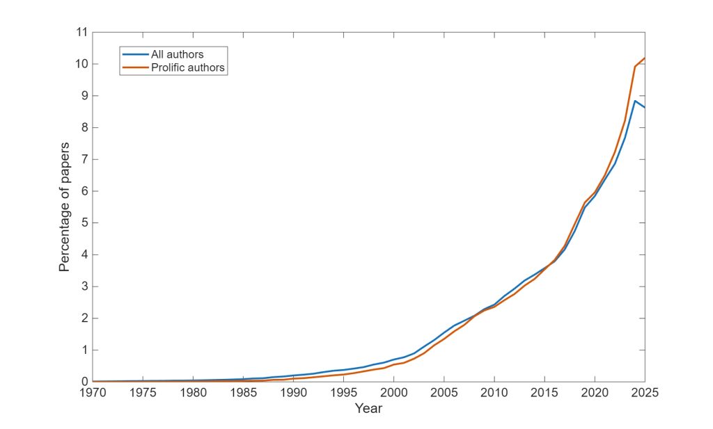 If we define prolific authors as those who have published over 500 papers during their career, we can plot the percentage of their papers over the years, compared to the same for all other (less “productive”) authors. As the figure below shows, for most of the time since 1970 the two groups have looked similar. Then, since around 2020, they’ve began to diverge, and the prolific authors begin to publish much more than the rest of us.
